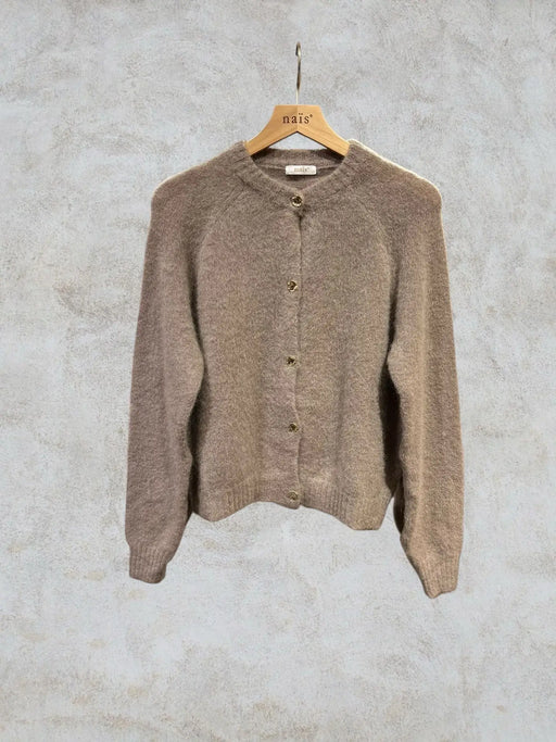 Katso tarkemmat tuotetiedotLyhyt villasekoitus neuletakki Klassisen mallinen ja hieman lyhyempi neuletakki, missä on pyöreä pääntie ja kauniit kullanväriset napit. One size -...