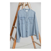 Project AJ117 Kirsa -paitapusero on valmistettu kevyestä ja pehmeästä tencelistä. Kivasti farkkupaidan sävyyn värjätyssä paidassa on siniset napit ja rintataskut. Papinkaulus lisään paidan eleganttia rentoutta.