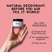 Kevyt ja helposti levittyvä voidemainen deodorantti imeytyy hyvin iholle ja antaa kokopäiväisen suojan hienhajua vastaan. Voiteen koostumus on pehmeän kermainen. Innovatiivinen luonnonraaka-aineiden sekoitus takaa täydellisen suojan ja hoitaa samalla kainaloalueen herkkää ihoa. Raikas palmarosan ja mandariinin tuoksu lisää raikkauden tunnetta ja virkistää.