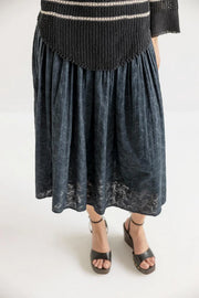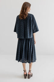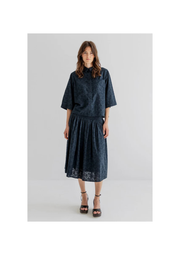 Project AJ117 Hazel on brodeeratusta luomupuuvillasta valmistettu hame, jossa on pehmeää volyymia ja kauniisti laskeutuva siluetti. Vyötäröllä on joustava smokkirypytys, joka tuntuu mukavalta päällä ja luo hameeseen kevyttä poimutusta. Kankaan teksturoitu brodeeraus tuo siihen rakennetta säilyttäen ilmeen samalla kevyenä ja naisellisena. Yhdistä yhteensopivaan Project AJ117 Hortense-paitaan viimeistellyn kokonaisuuden luomiseksi.