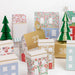 5 numeroitua paperilaatikkoa,  joissa on sekoitus iloisia Liberty kukka- ja tähtiprinttejä. Laatikoiden päällä on paperiset kuusikoristeet joko vihreänä tai vihreillä ja kermanvärisillä raidoilla.
