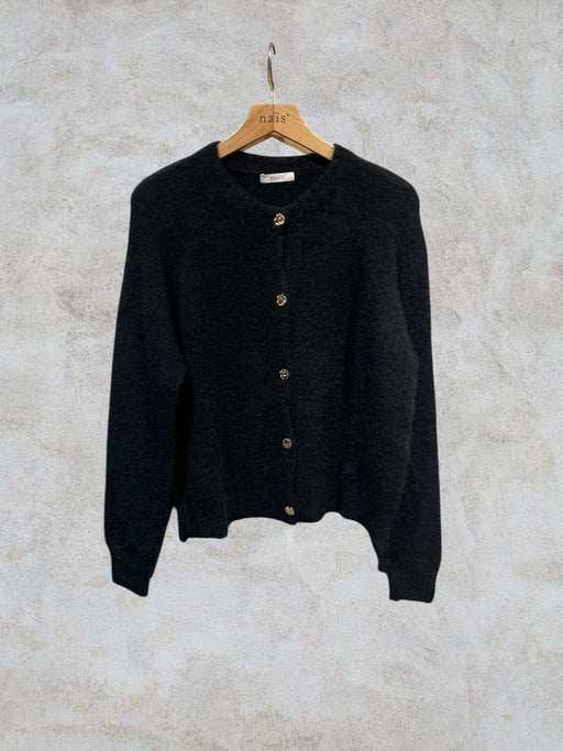 Lyhyt villasekoitus neuletakki Klassisen mallinen ja hieman lyhyempi neuletakki, missä on pyöreä pääntie ja kauniit kullanväriset napit. One size -...