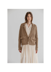 Project AJ117 Copenhagen BARNEY on neulottu bleiserityylinen neuletakki, jossa on räätälöityjä yksityiskohtia ja rento reunus. Se on suunniteltu strukturoidusta puuvillasekoitteesta ja siinä on pehmeän tuntuinen kangas. Neuletakissa on klassinen kaulus, etutaskut ja nappikiinnitys. Istuvuus on normaali ja hieman lyhyempi, joten se on helppo yhdistää sekä mekkojen että housujen kanssa.