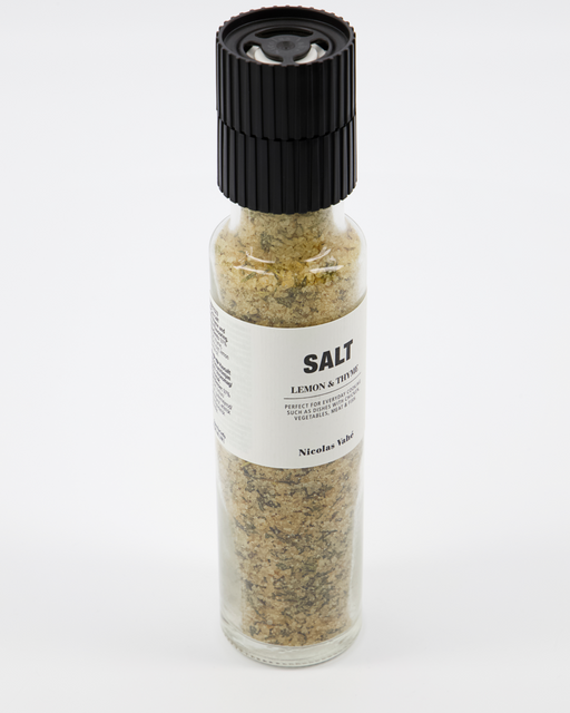 Sitruuna-timjamisuola myllyssä Nicolas Vahen herkullinen timjamilla ja sitruunalla maustettu merisuola kätevään ja tyylikkääseen maustemyllyyn pa...