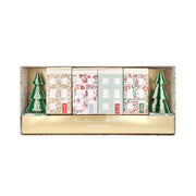 5 numeroitua paperilaatikkoa,  joissa on sekoitus iloisia Liberty kukka- ja tähtiprinttejä. Laatikoiden päällä on paperiset kuusikoristeet joko vihreänä tai vihreillä ja kermanvärisillä raidoilla.